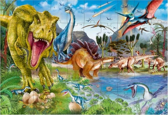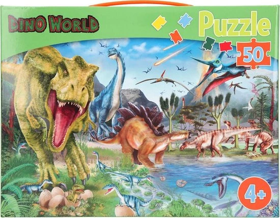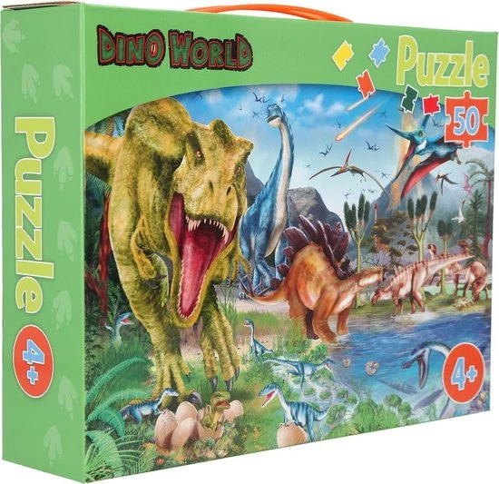 Een koffer vol dino’s: de coole puzzel van Dino World bestaat uit 50 stukjes en als hij klaar is heeft hij het formaat van 58 x 40 cm. Aanbevolen vanaf 4 jaar.