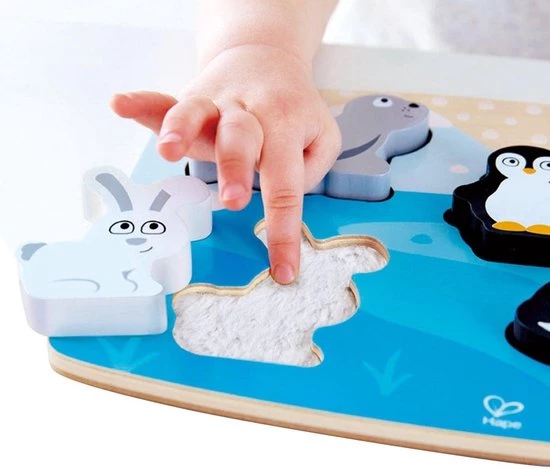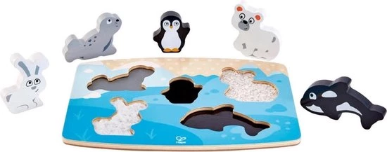 Het is koud op de Noordpool en de dieren hebben hun speciale huidbedekking nodig om warm te blijven! Deze vormenpuzzel van Hape geeft jou de mogelijkheid om te puzzelen en te ervaren hoe verschillende pooldieren aanvoelen. Verwijder de puzzelstukken om de huidbedekking van de zeehond, pinguïn, ijsbeer, sneeuwhaas en orka te voelen.