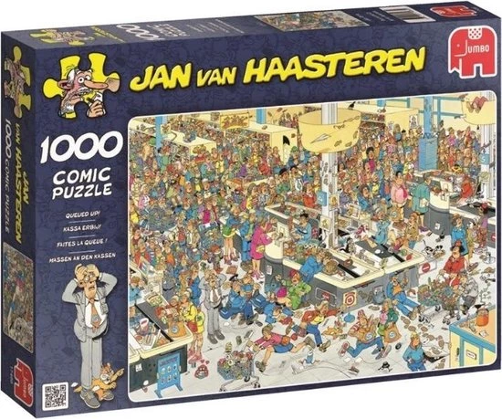 De Jan van Haasteren Kassa Erbij! puzzel van 1000 stukjes laat blijken dat alles in de supermarkt altijd een beetje chaotisch verloopt.