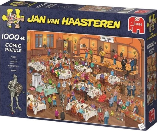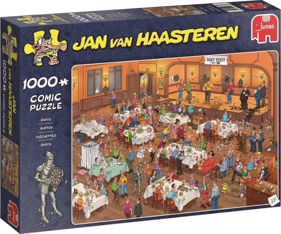 Jan van Haasteren Darts met 1000 Stukjes is een van de nieuwe puzzels van Jan van Haasteren. Tijdens dit Dart toernooi verloopt niet alles even soepel. Darts van Jan van Haasteren puzzel met 1000 stukjes voor de echte Jan van Haasteren fans! Zodra je Jan van Haasteren Darts met 1000 Stukjes begint te puzzelen stuit je op het ene na het andere hilarische tafereel.