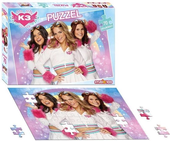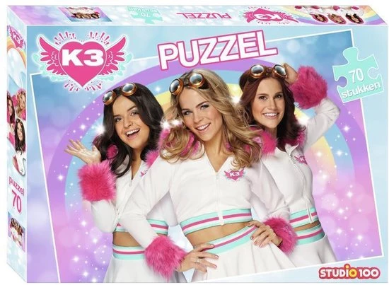 K3 puzzel dromen Laat je meeslepen in deze dromenpuzzel van K3. Op deze puzzel staat een afbeelding van Marthe, Klaasje en Hanne met achter hun een regenboog. De puzzel bestaat uit 70 stukjes en is 32,5 x 22,5cm groot. Geschikt voor kinderen vanaf3 jaar.