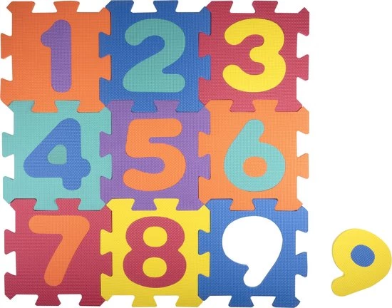 De mat is gemaakt van polyetheen, een soort foam, van 1 centimeter hoog. Dat vormt een zachte ondergrond voor je kleintje. De speelmat bestaat uit kleurrijke puzzelstukken met de cijfers van 1 tot en met 9. Alle stukken kunnen losgemaakt worden en weer aan elkaar gezet. Ook de cijfers in de stukken kunnen eruit genomen worden. Deze speelmat bestaat dus uit 18 onderdelen. Elk puzzelstuk is circa 32 x 32 centimeter groot. Dat maakt dat dit kleed dus circa 1 x 1 meter groot is.
