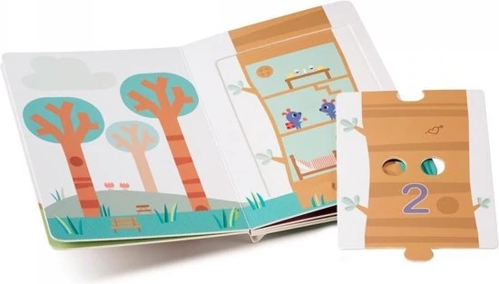 Ontdek samen met je kind welke vriendjes in de boom wonen en tel ze aan de hand van de vensters op de puzzelstukken. Naarmate het verhaal vordert plaats je de puzzelstukken boven elkaar, van 1 tot 5. Zo bekom je uiteindelijk een reuzegrote boom. De puzzel is recto verso, dubbel plezier!