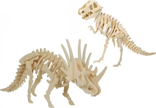 Houten 3D dino puzzel bouwpakket set T-rex en styracosaurus. Houten dino 3D puzzels om zelf in elkaar te zetten, met instructies. Materiaal: licht hout (triplex). Niet geschikt voor kinderen onder de 3 jaar. 3D dinosaurussen dieren bouwspeelgoed. Afmetingen: 38,2 x 9 x 28,5 cm en 23 x 18,5 x 0,3 cm. bestaande uit 1x Houten 3D puzzel T-rex dinosaurus 38 cm, 1x Houten 3D puzzel styracosaurus dinosaurus 23 cm
