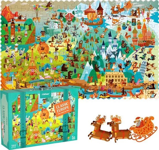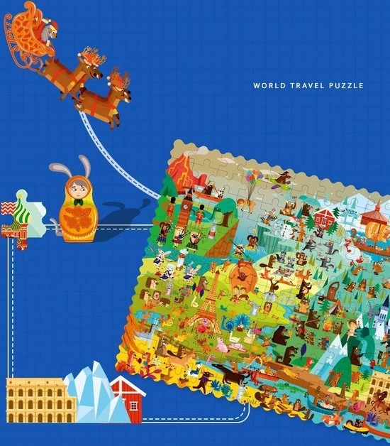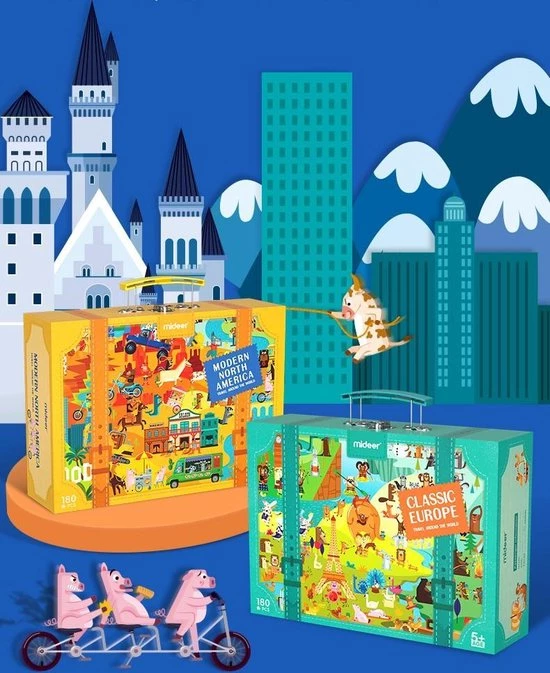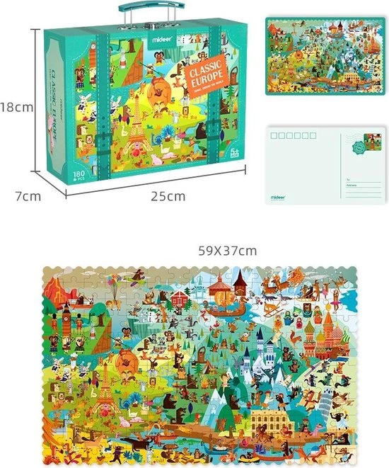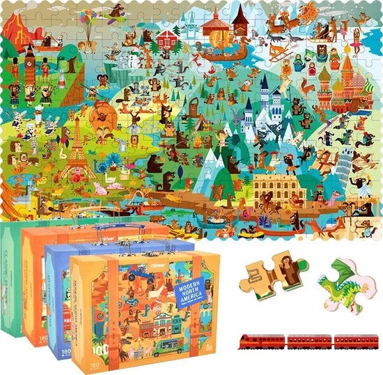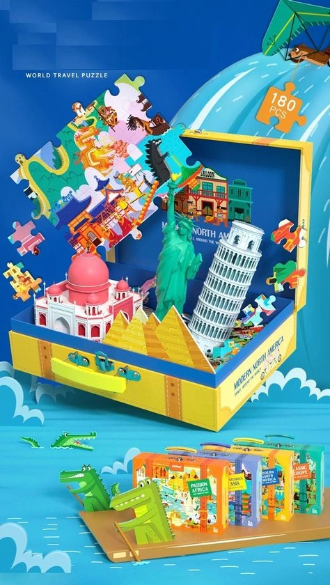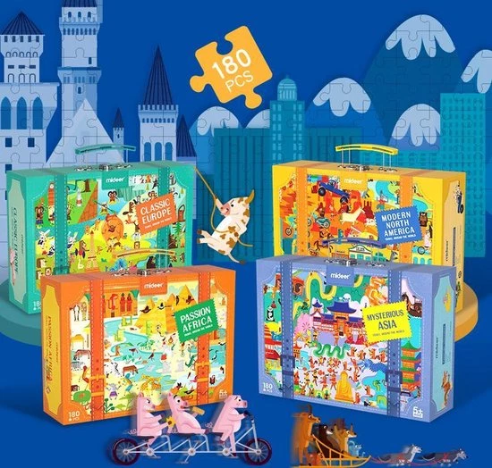 Deze fantastische puzzel is een leuke bezigheid voor de gehele familie. Verbetert de hand-oog coördinatie, motorische vaardigheden en probleemoplossend vermogen van kinderen. Bestaat uit 180 grote puzzelstukken. De mooie verpakking maakt het ook een perfect geschenk. De puzzelset wereldreizen en menselijke geografie geeft een levendig beeld van de cultuur en het leven over de hele wereld! Pak deze zeer mooie koffer en reis de wereld rond!
