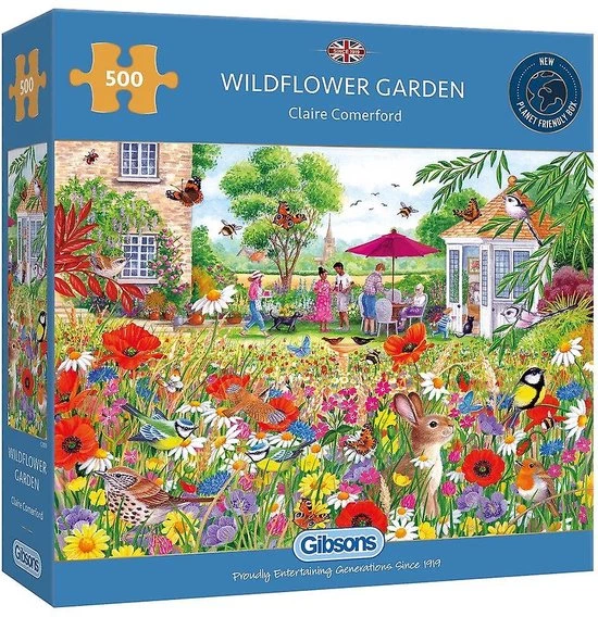 Wildflower Garden is een hoogwaardige puzzel van 500 stukjes van Gibsons. Kunstenaar: Claire ComerfordIn dit prachtige tafereel straalt een heldere landelijke tuin van leven. Op de achtergrond stromen families naar Garden Teahouse voor een glaasje koude limonade. Of je nu een natuurliefhebber bent of gewoon geniet van het samenstellen van een kleurrijke legpuzzel, deze is voor jou.Voltooide puzzelgrootte: 48 x 34cmEr wordt een poster met illustraties meegeleverd die je kunt raadplegen terwijl je je puzzel in elkaar legt.Gibsons staan bekend om hun legpuzzel puzzels met zorgvuldig geïllustreerde stukjes die zijn gemaakt van duurzaam 100% gerecycled karton van de hoogste kwaliteit en zijn gemaakt met het dikste puzzelbord op de markt (2,33 mm). De prachtig geïllustreerde stukken zijn ontworpen om perfect te passen. De planeetvriendelijke puzzeldoos heeft een frisse nieuwe look en Gibsons Games heeft biologisch afbreekbare doorzichtige labels gebruikt om het deksel te bevestigen in plaats van krimpfolie om het plastic afval te verminderen. Gibsons gebruiken een plantaardige glanscoating op de doos voor extra bescherming en de puzzelstukjes worden bewaard in een plastic zak die door de meeste gemeenten kan worden gerecycled.