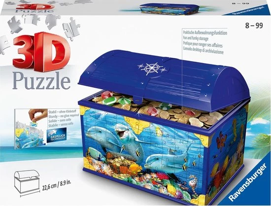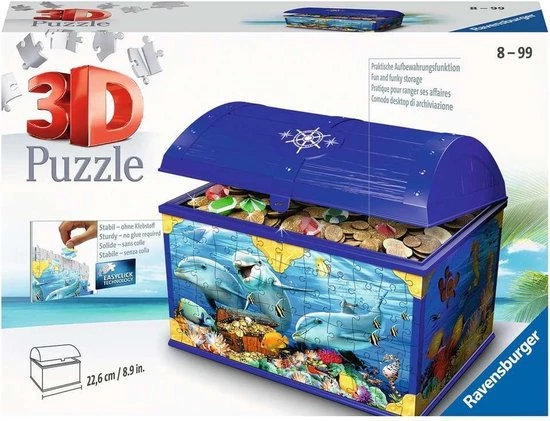 Gewoon uniek! Met 216 kunststof puzzelstukjes maak je een stevige opbergdoos met het thema onderwaterwereld, die iedere kamer een coole look geeft. Gewoon puzzelen, accessoires erop doen en klaar is je opbergdoos! Heel erg praktisch met een flexibel inlegvak! Je kunt er van alles in doen – schatten, brieven, prulletjes.