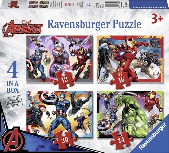 Ontsnap uit de realiteit en stap in de wereld van Ravensburger puzzels. Tijdens het puzzelen ontdekken kinderen hun grootse vaardigheden. Maak wel 4 verschillende puzzels met de speciale 12+16+20+24 puzzle box van Ravensburger! Dankzij de met de hand gemaakte stansmessen is de vormvariatie van de stukjes oneindig. Kinderen vanaf 3 jaar zullen genieten van de The Avengers puzzels met 12, 16, 20 en 24 stukjes. Ravensburger puzzels met 12, 16, 20 en 24 stukjes met als thema The Avengers