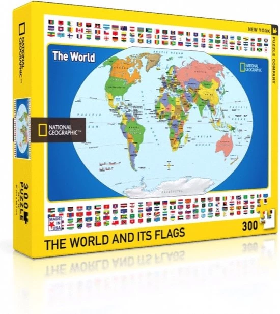 Op deze puzzel van New York Puzzle Company staat een kaart van de wereld, origineel van van National Geographic. Alle landen en continenten zijn gemarkeerd en hebben een kleurcode en de vlaggen van alle landen staan ??bovenaan en onderaan de kaart. De puzzel heeft 300 stukjes en heeft een linnen stijl afwerking zodat de puzzel minder glimt. Aanbevolen leeftijd: 7+ jaar.