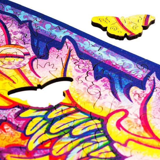 Ontsnap de realiteit en ontdek het universum van deze houten puzzel van UNIDRAGON. Deze vlinder heeft prachtige, kleurrijke vleugels die bedekt lijken te zijn met sterrenstof. Wanneer je klaar bent met de puzzel kun je hem lijmen en als decoratie gebruiken. Hang hem aan de muur en kom helemaal tot rust. De vlinder bevat unieke puzzelstukjes in de vorm van verschillende dieren, bloemen en nog veel meer.